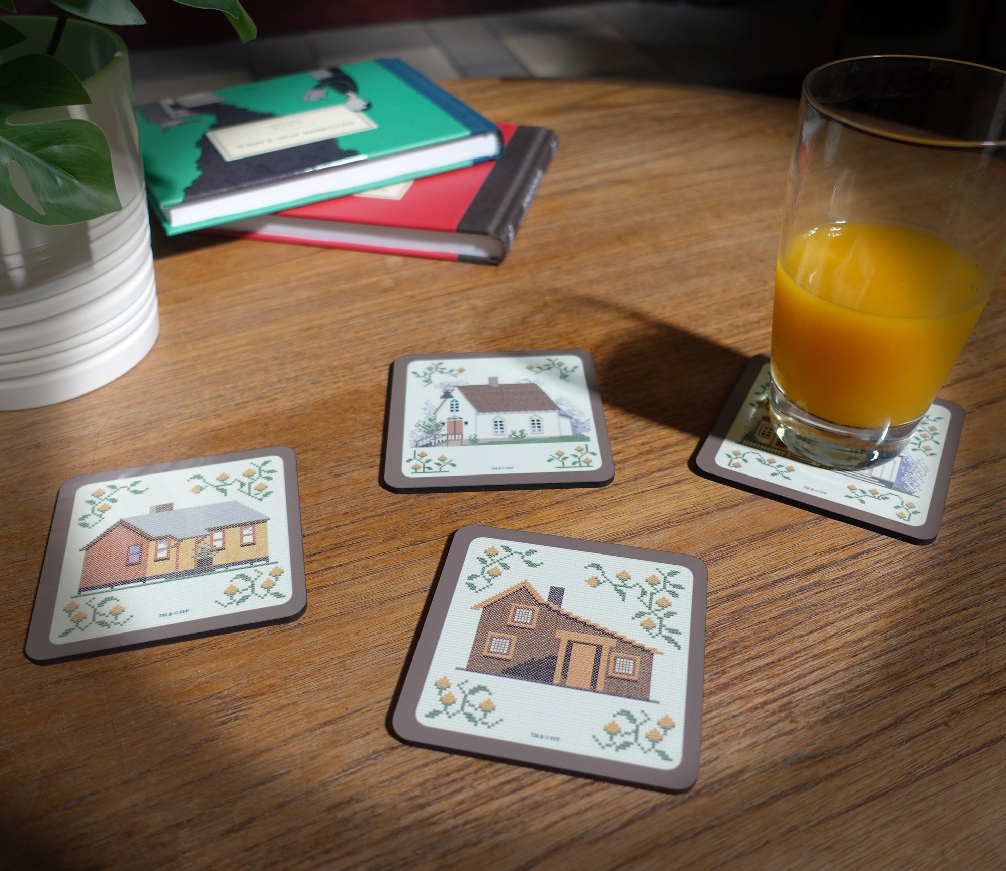 4 "Walnut Grove" coasters with iconic buildings from "Little House On The Prairie" ( The Little House, The Mercantile, The School/Church, The Wilders'house),